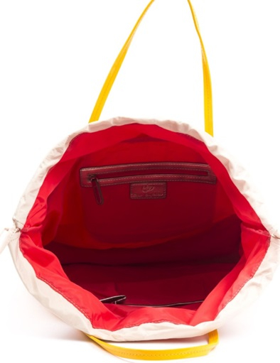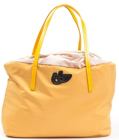 Dámska nákupná kabelka vyrobená z látky a syntetickej lakovanej kože.