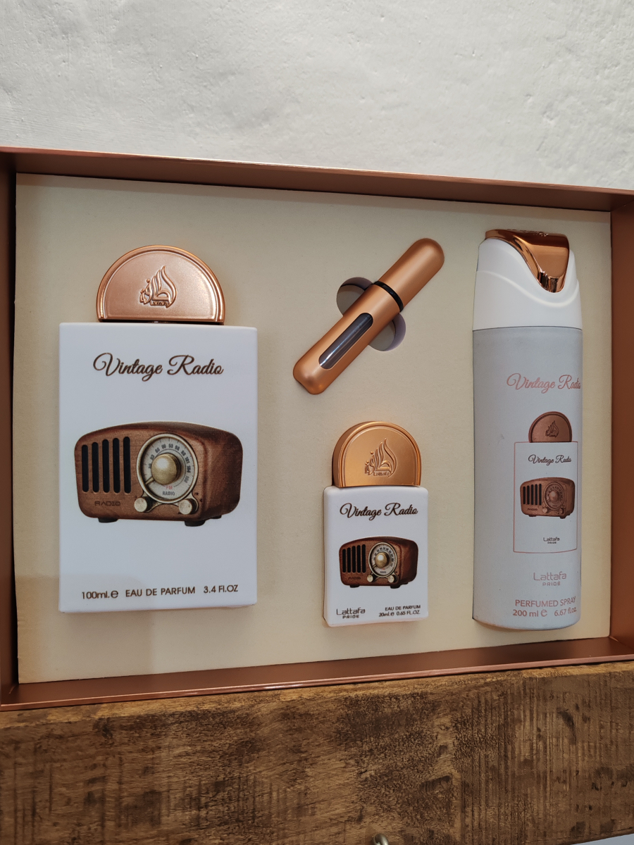 Lattafa Vintage Radio darčeková sada EDP 100 ml + EDP 20 ml + Perfumed Spray 200 ml + parfémový naplniteľný flakón 5ml